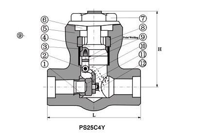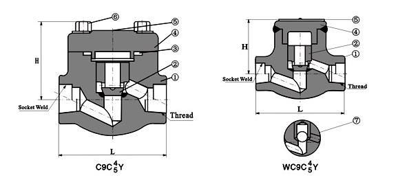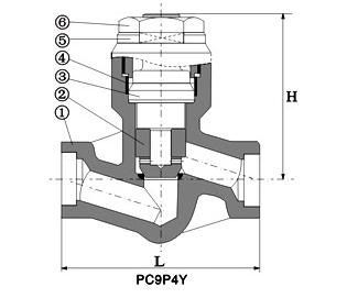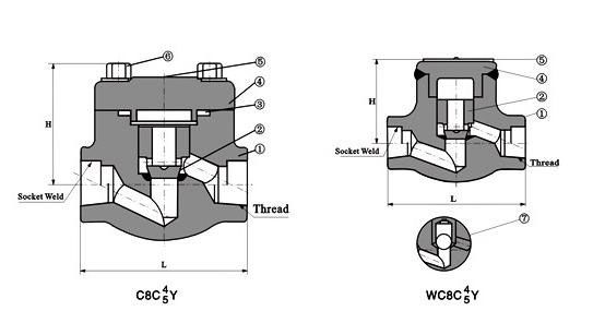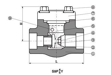 内螺纹锻钢止回阀设计结构和特征 止回阀的设计与制造符合MSSP-118和ASME B16.34.检验与测试按API 598,标记按MSS-SP-25. 采用以下结构