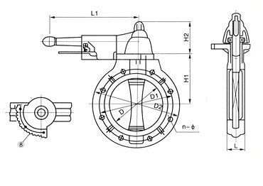 注:1.本蝶阀系列法兰孔径按GB2555-81,1.0Mpa标准。也可按用户要求按JIS,DIN,ANSI标准进行制作。